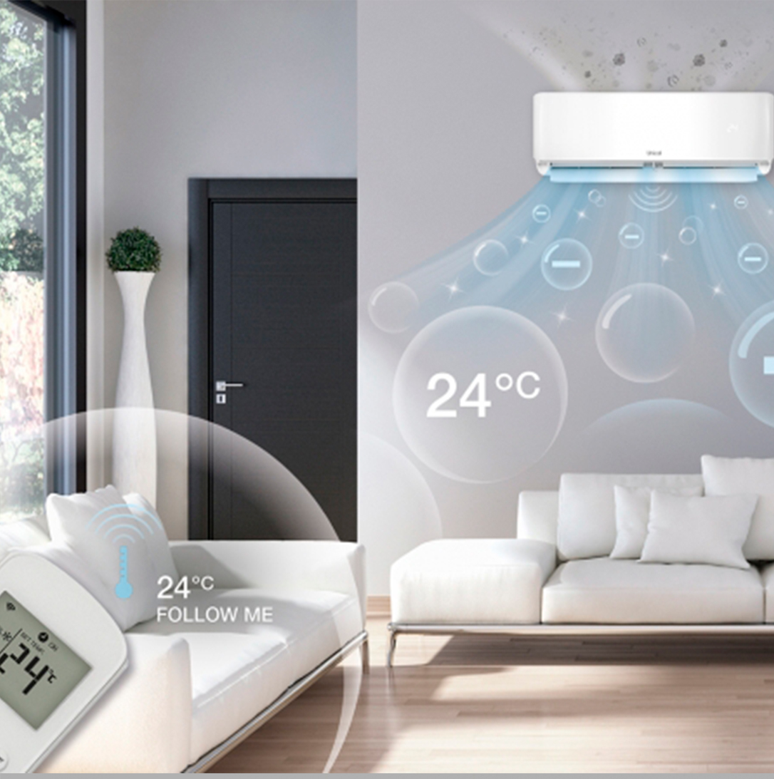 - Funcția „FOLLOW ME”: mod exclusiv care conferă telecomenzii funcția de termostat: aceasta garantează atingerea efectivă a temperaturii dorite a camerei într-un mod precis și rapid și un confort de 360° atât în modul de încălzire (iarna), cât și în cel de răcire (vara).