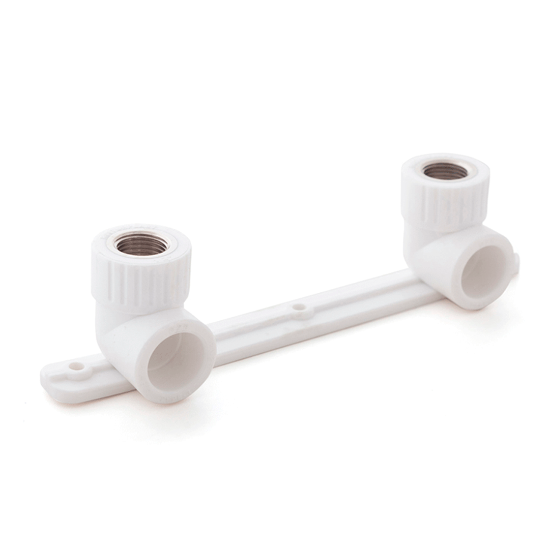 Placă de perete cot „Rosturplast” dublu, cu filet feminin, se aplică pentru asamblarea țevilor PPR și simplifică asamblarea diferitelor elemente, precum și modificările direcției conductei de apă la unghi ridicat. Este legat de conducta principală a diferitelor echipamente sanitare. Principalul beneficiu este montarea pe perete rigid / alte suprafețe.